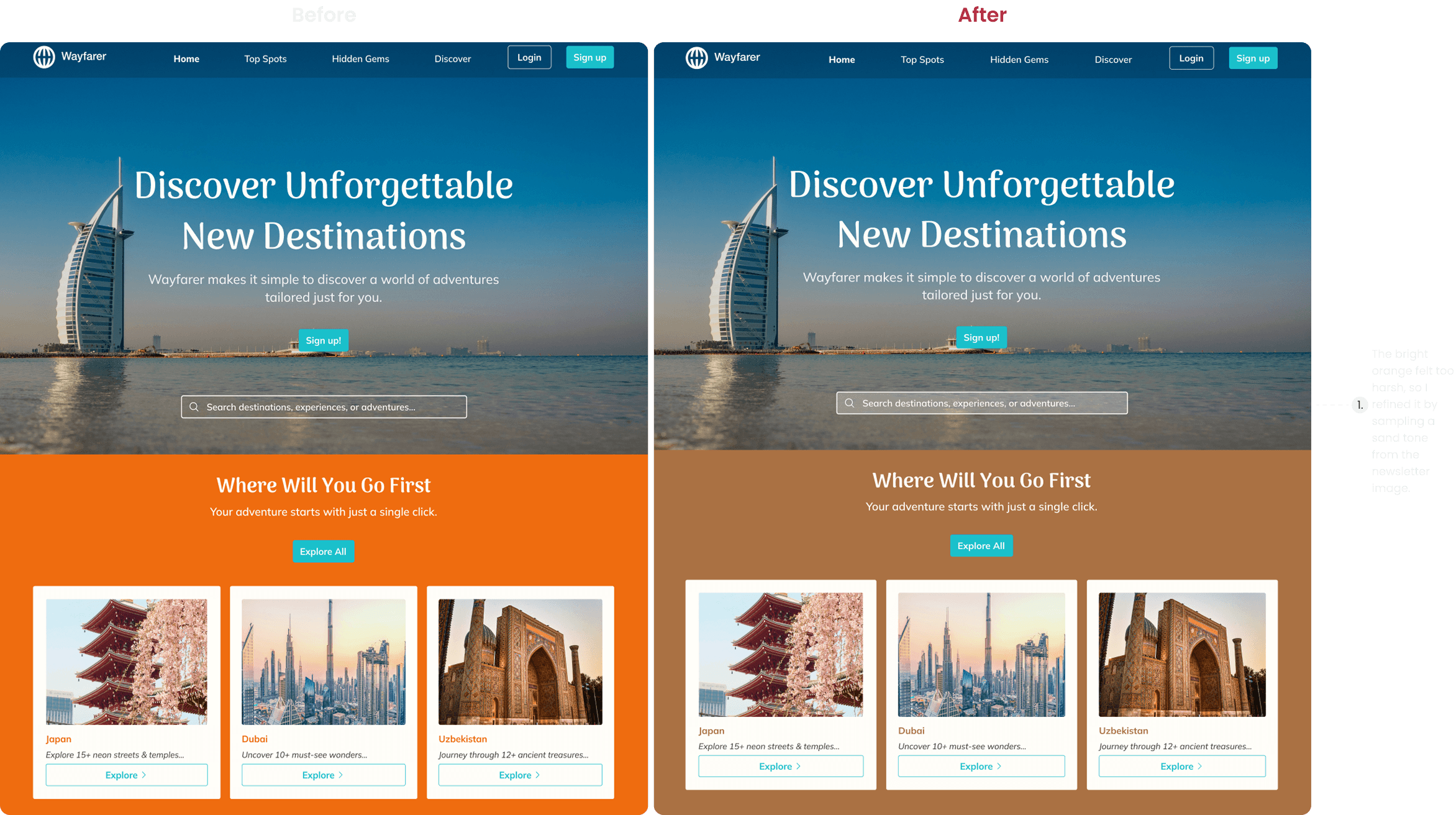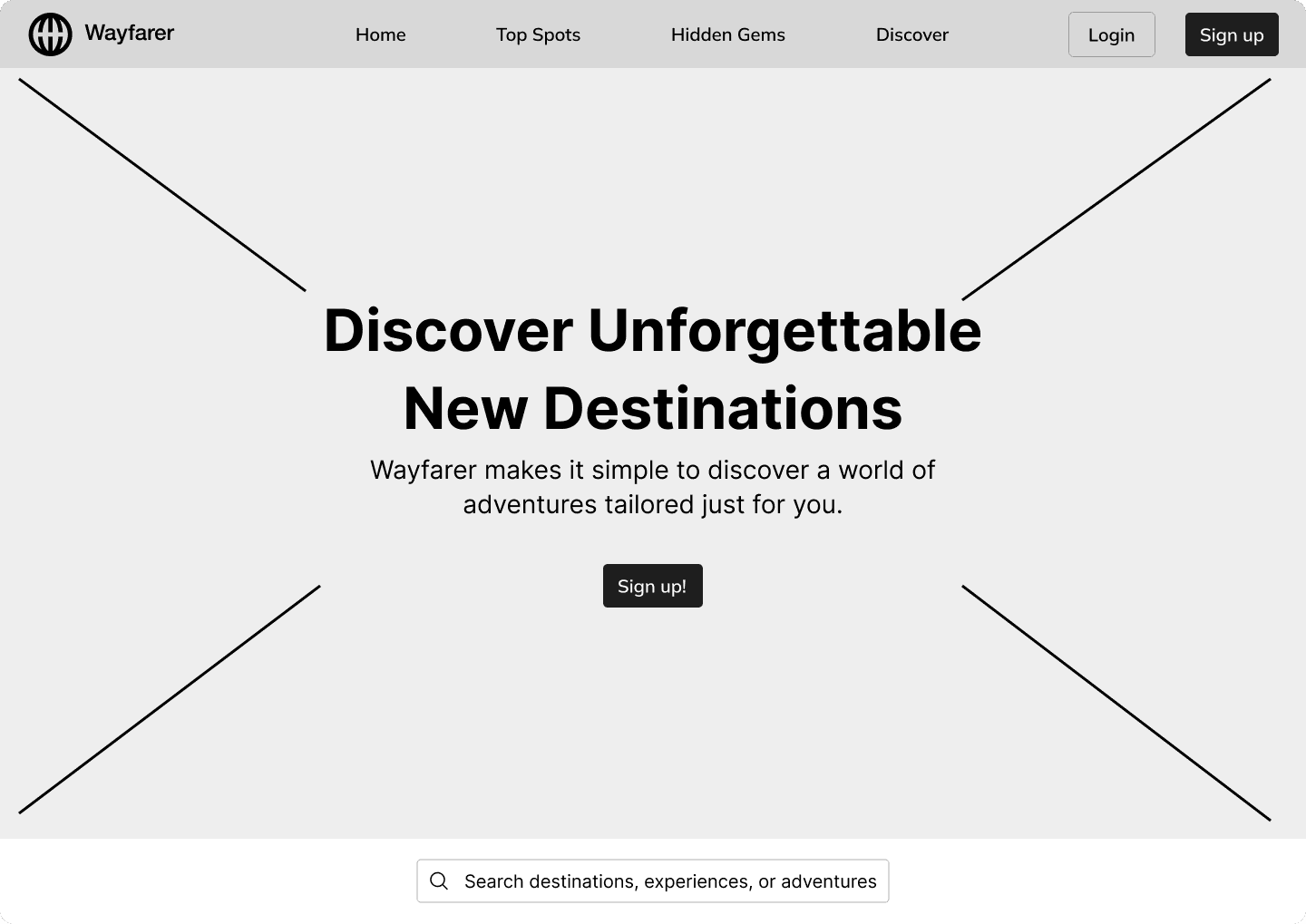 Wayfarer’s existing homepage lacked visual hierarchy and felt difficult to navigate. The layout didn’t effectively showcase destinations or inspire users to explore.