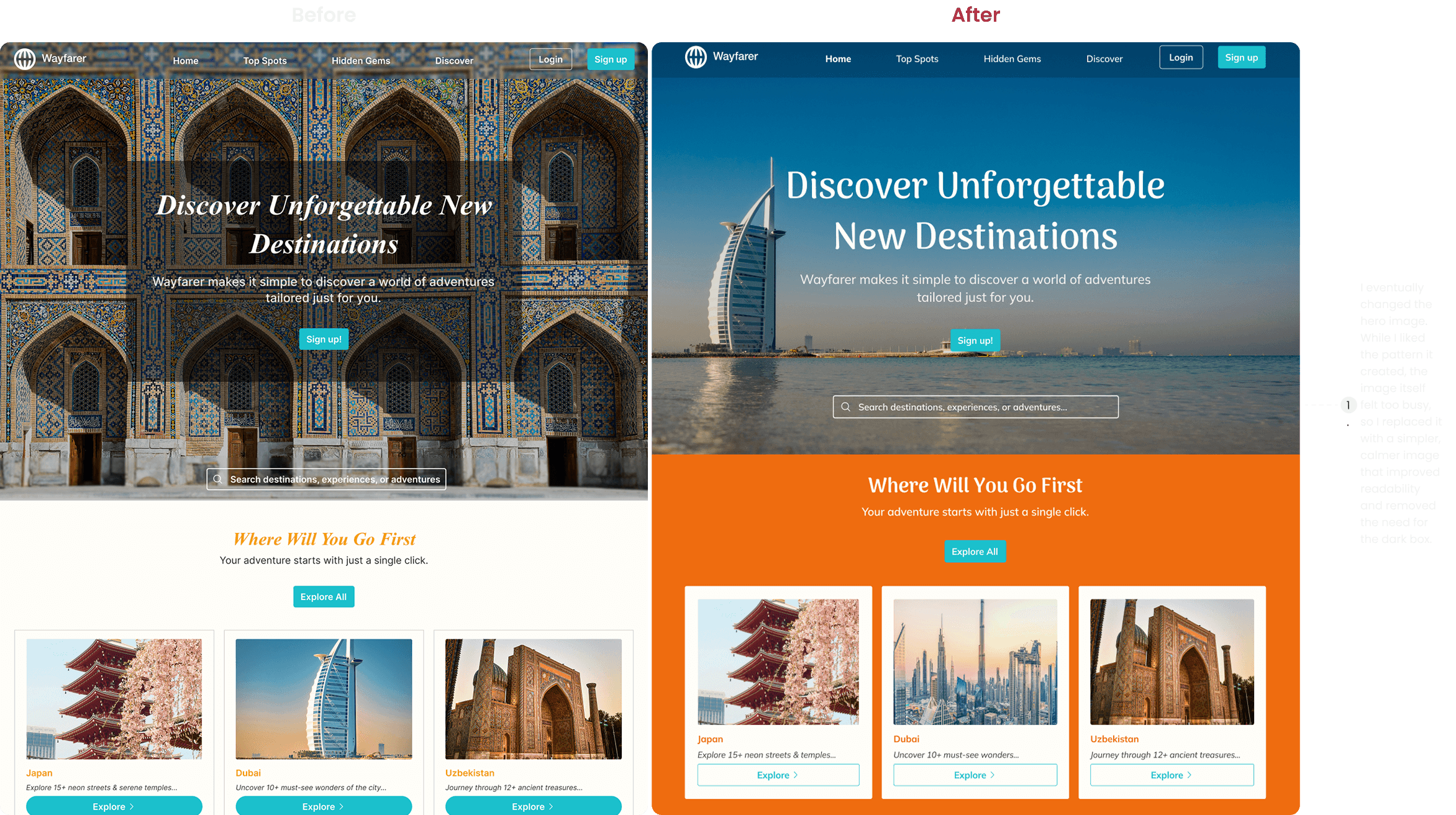 Because travel is a visual experience, I decided to make the hero section feature a large image, helping immerse the user and immediately draw them into exploring further.